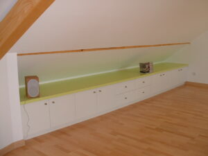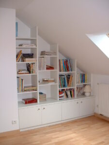 Aménagement de meubles bas et bibliothèque sous rampant..