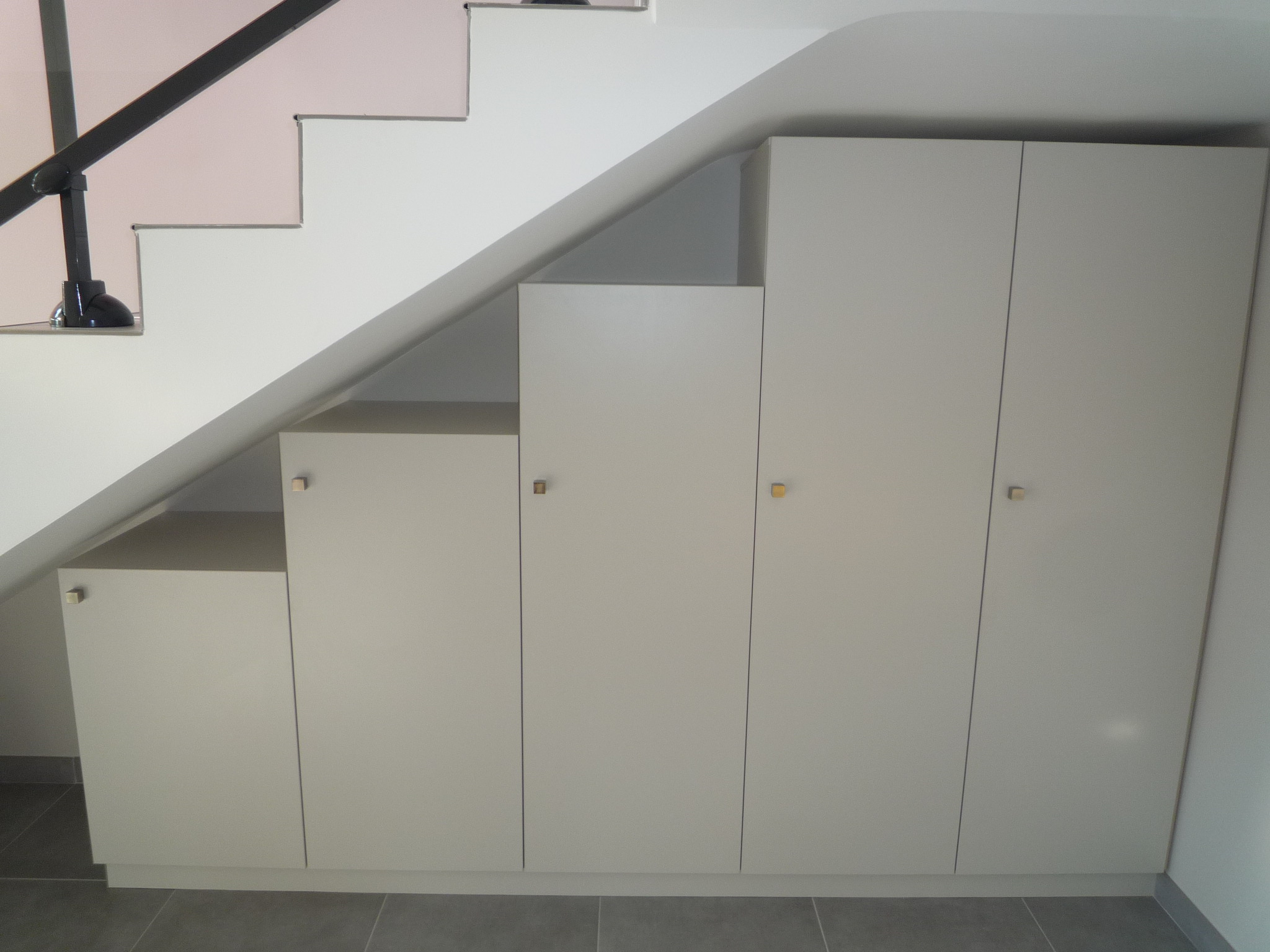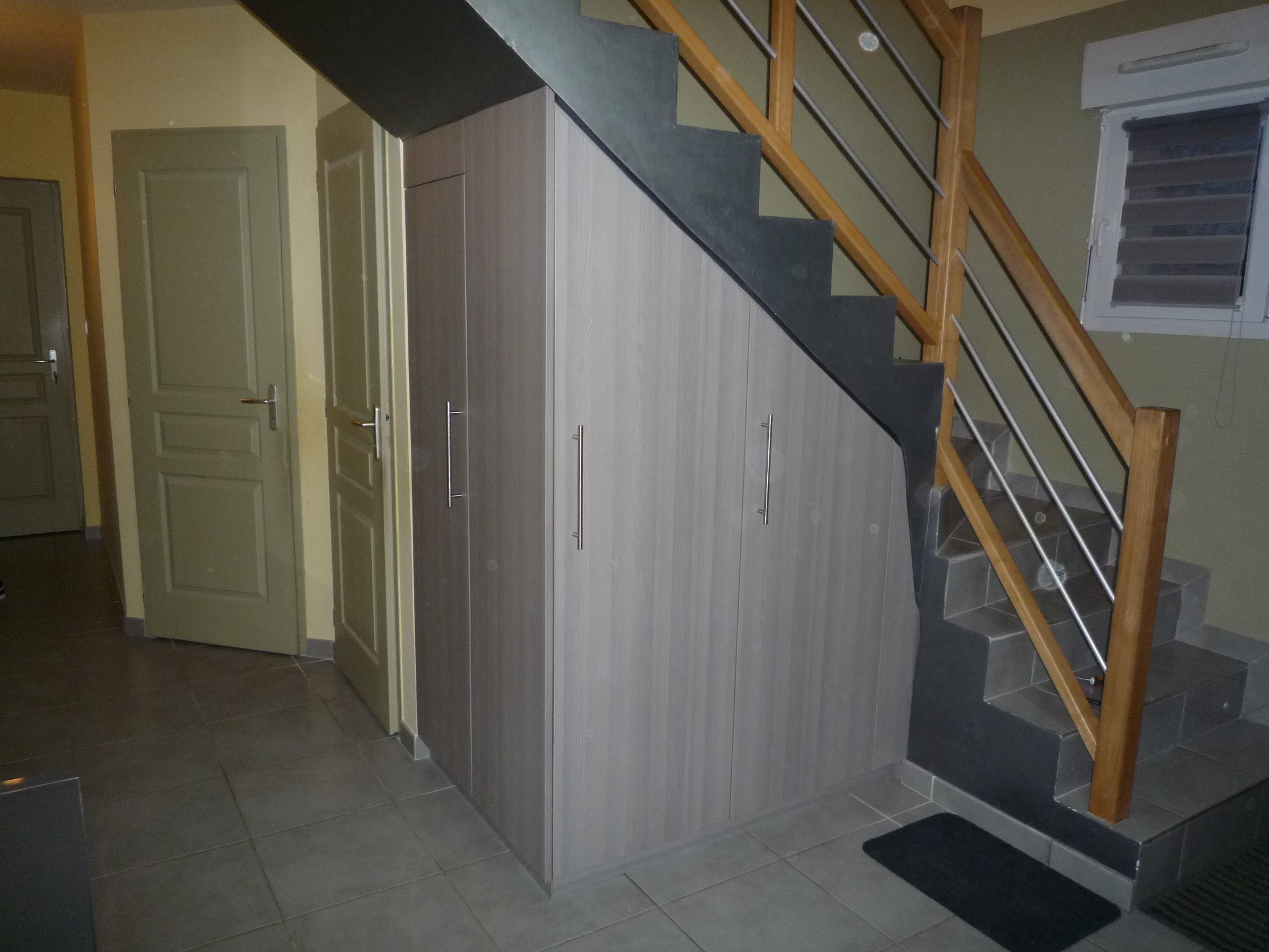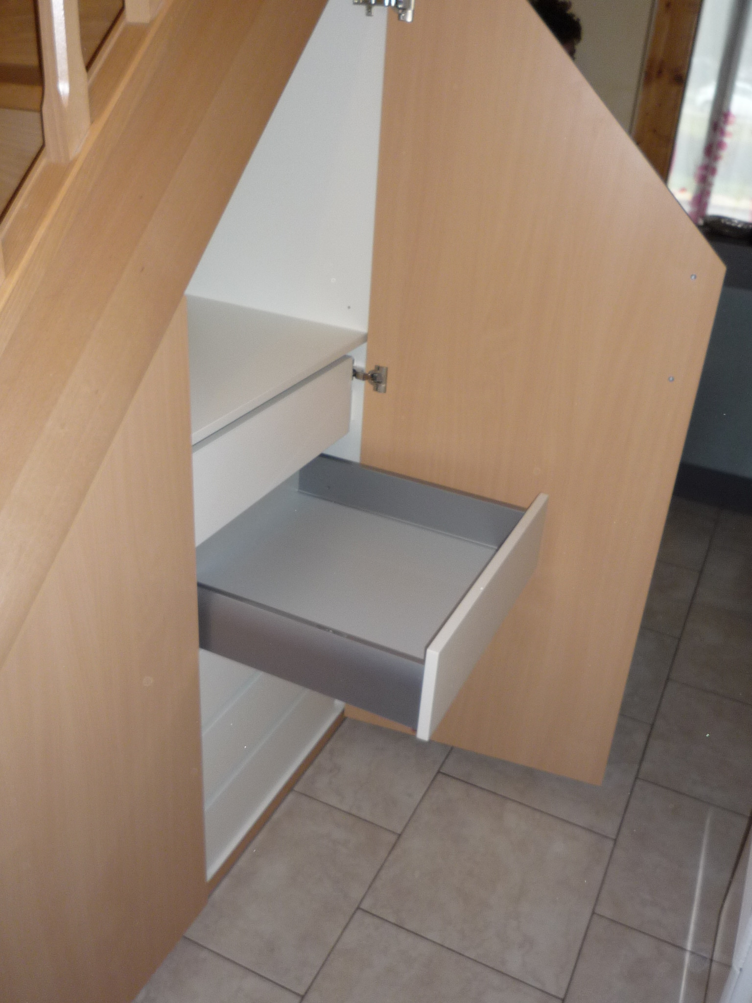 Placard sous-escalier avec deux portes suivant le rampant de l’escalier dont une avec un bloc tiroirs intégré et une double-porte avec accès en bout.