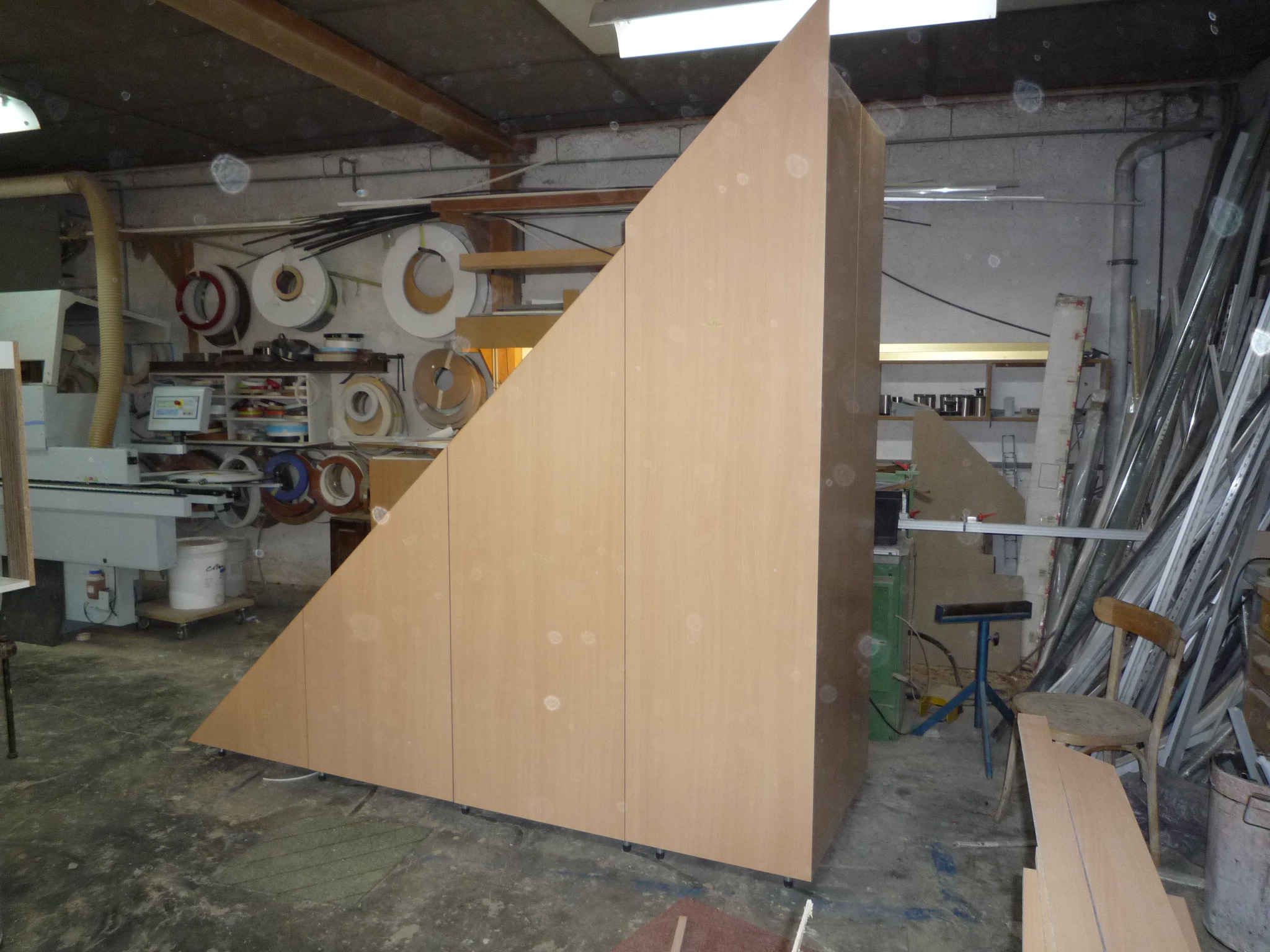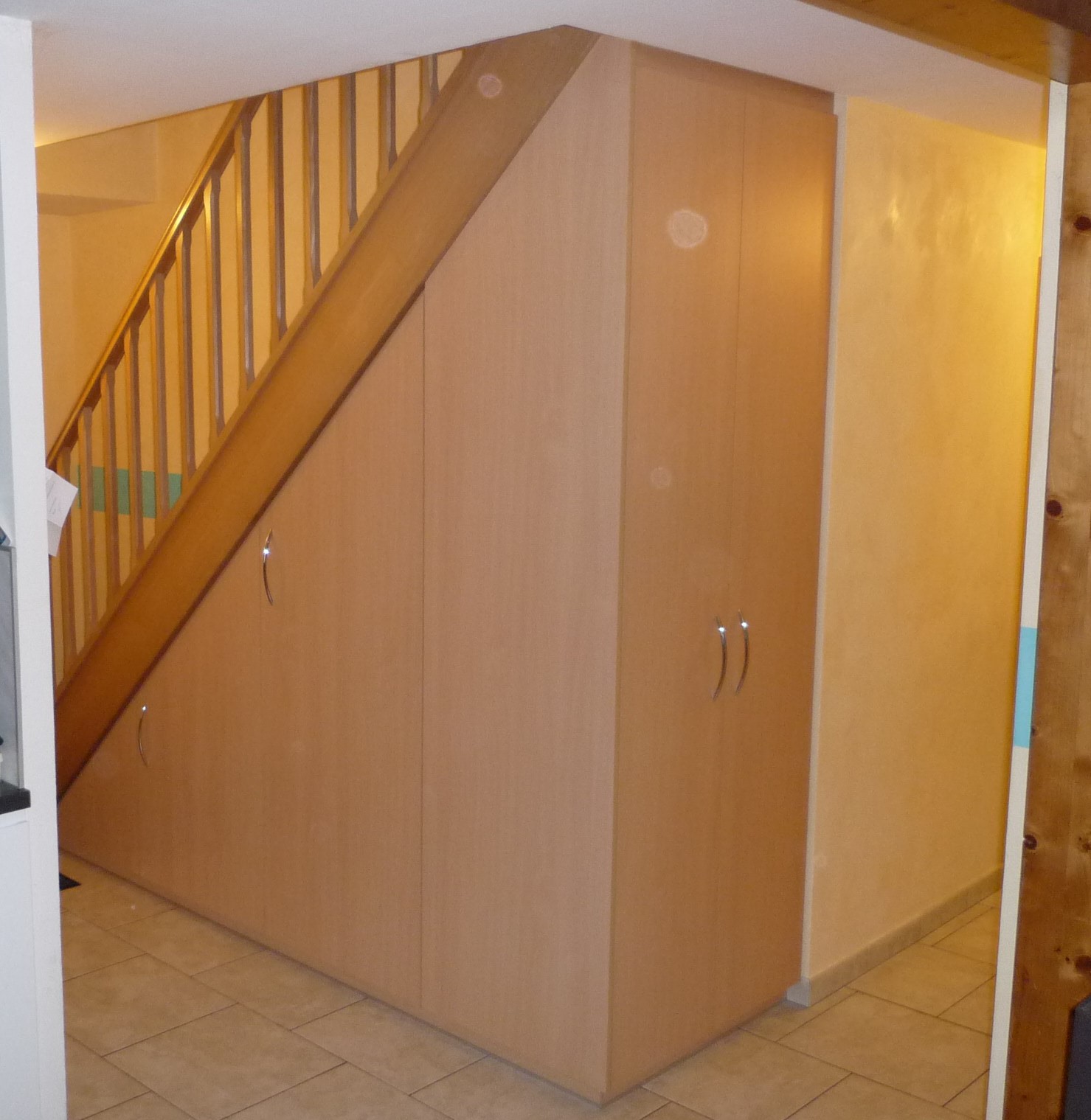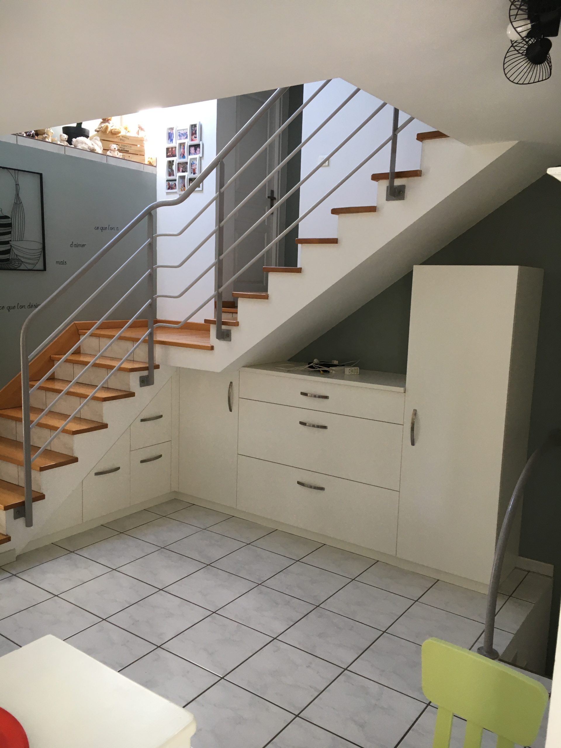 Placard sous-escalier avec deux portes suivant le rampant de l’escalier dont une avec un bloc tiroirs intégré et une double-porte avec accès en bout.
