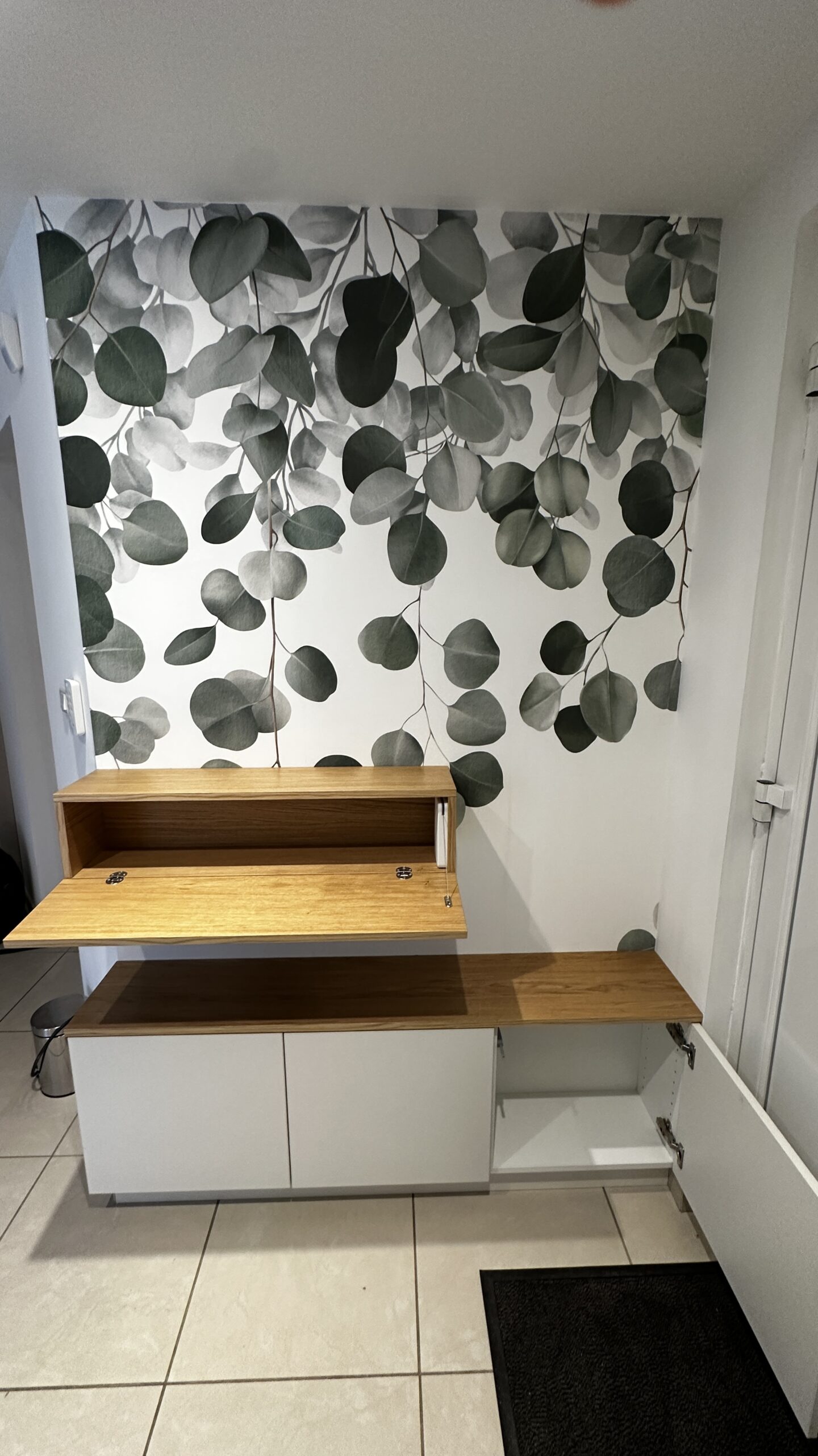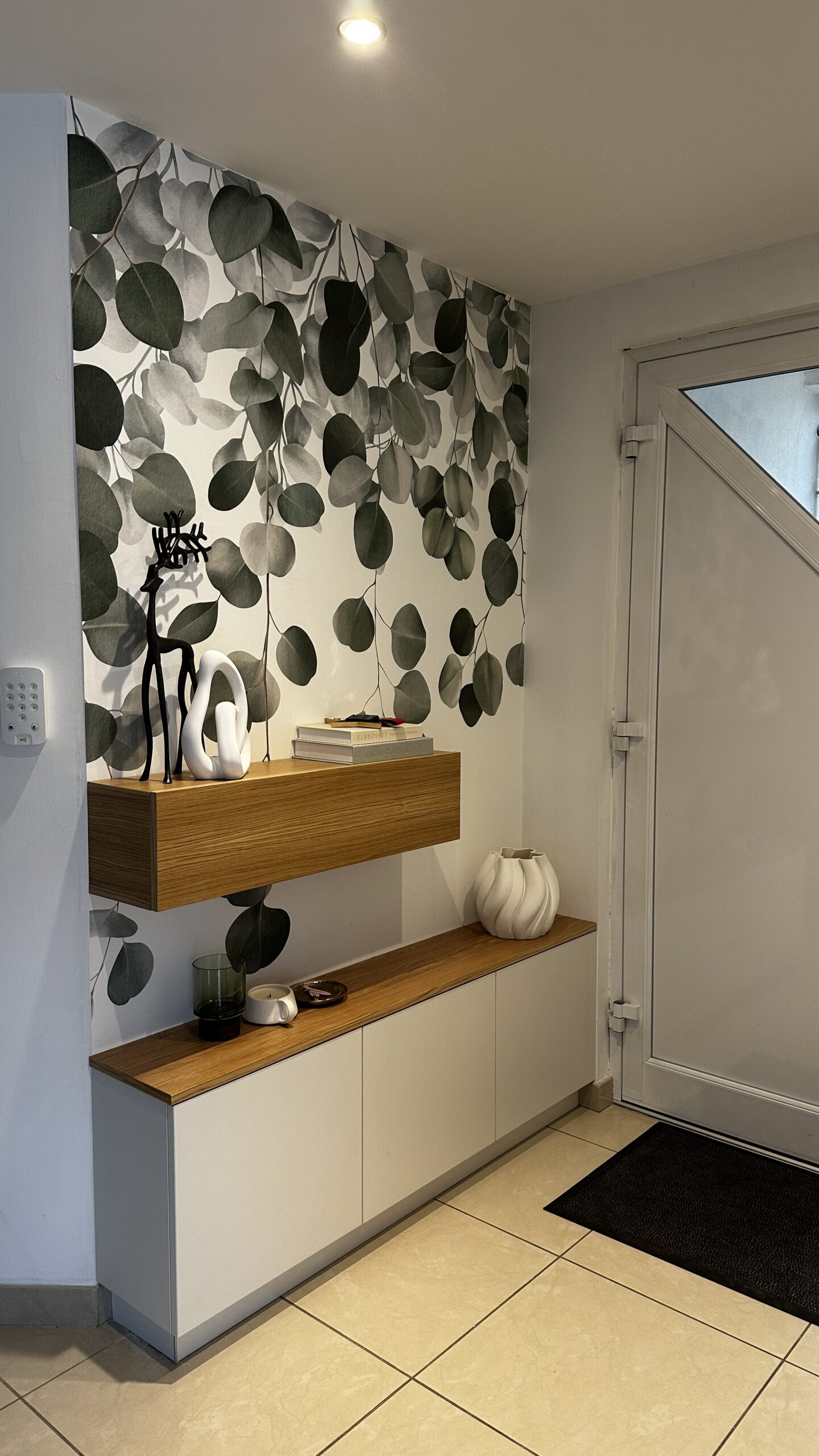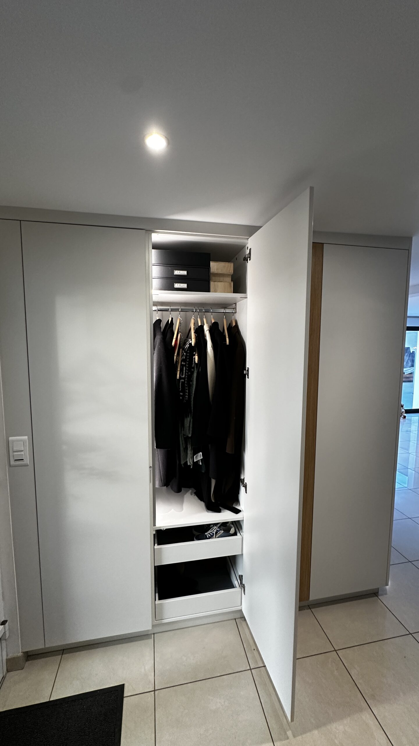 Placard d’entrée bicolore avec intérieurs lumineux se déclenchant à l’ouverture des portes, tiroirs à l’anglaise et portes à ouverture tip-on, sans poignée