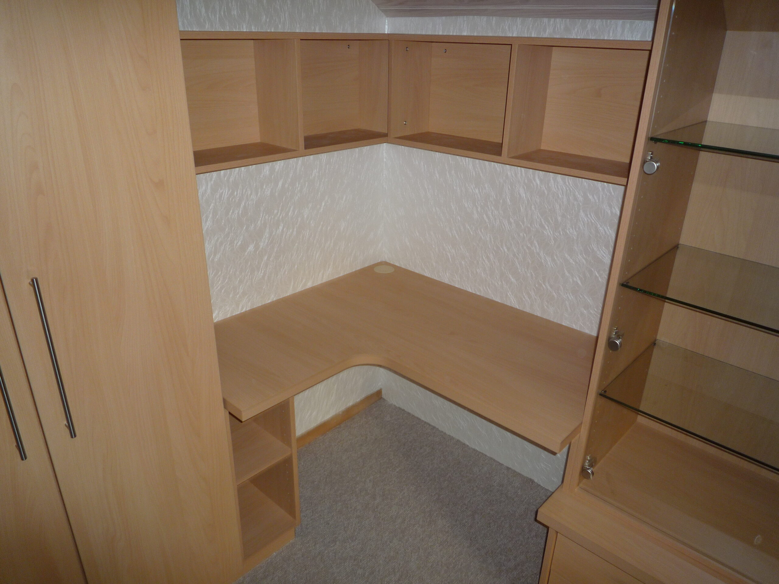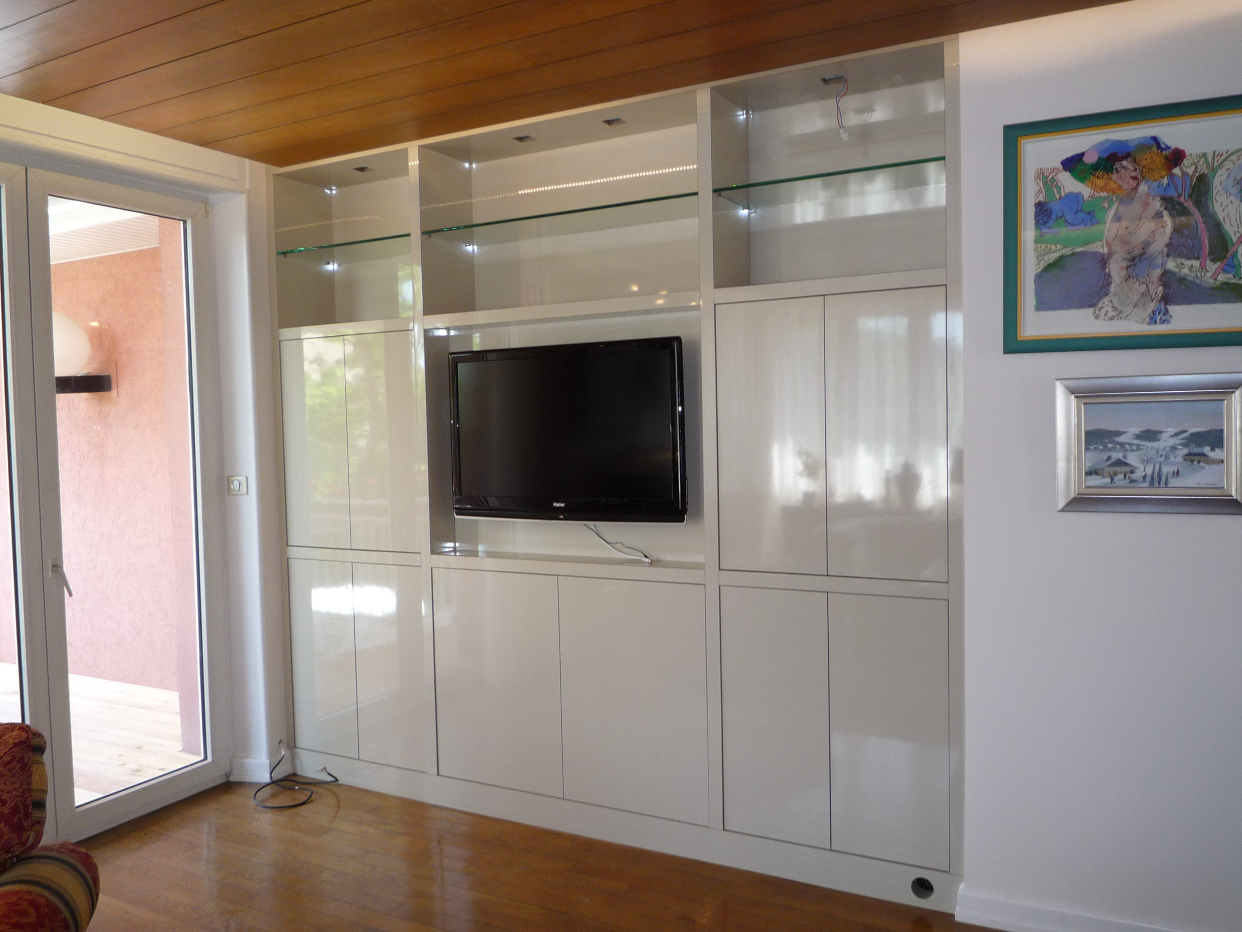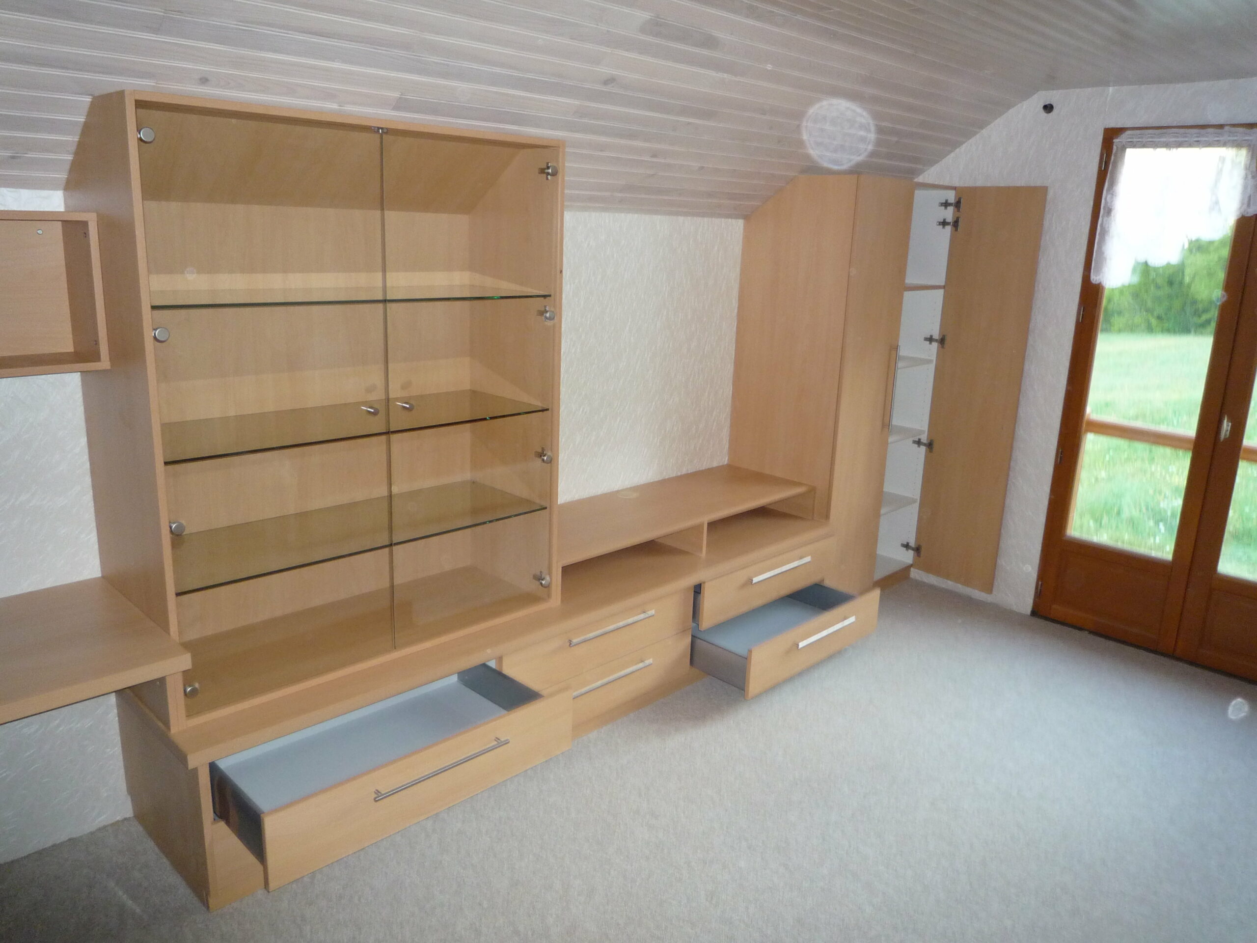 Des placards, un meuble TV, un joli bureau et une grande vitrine assortis..