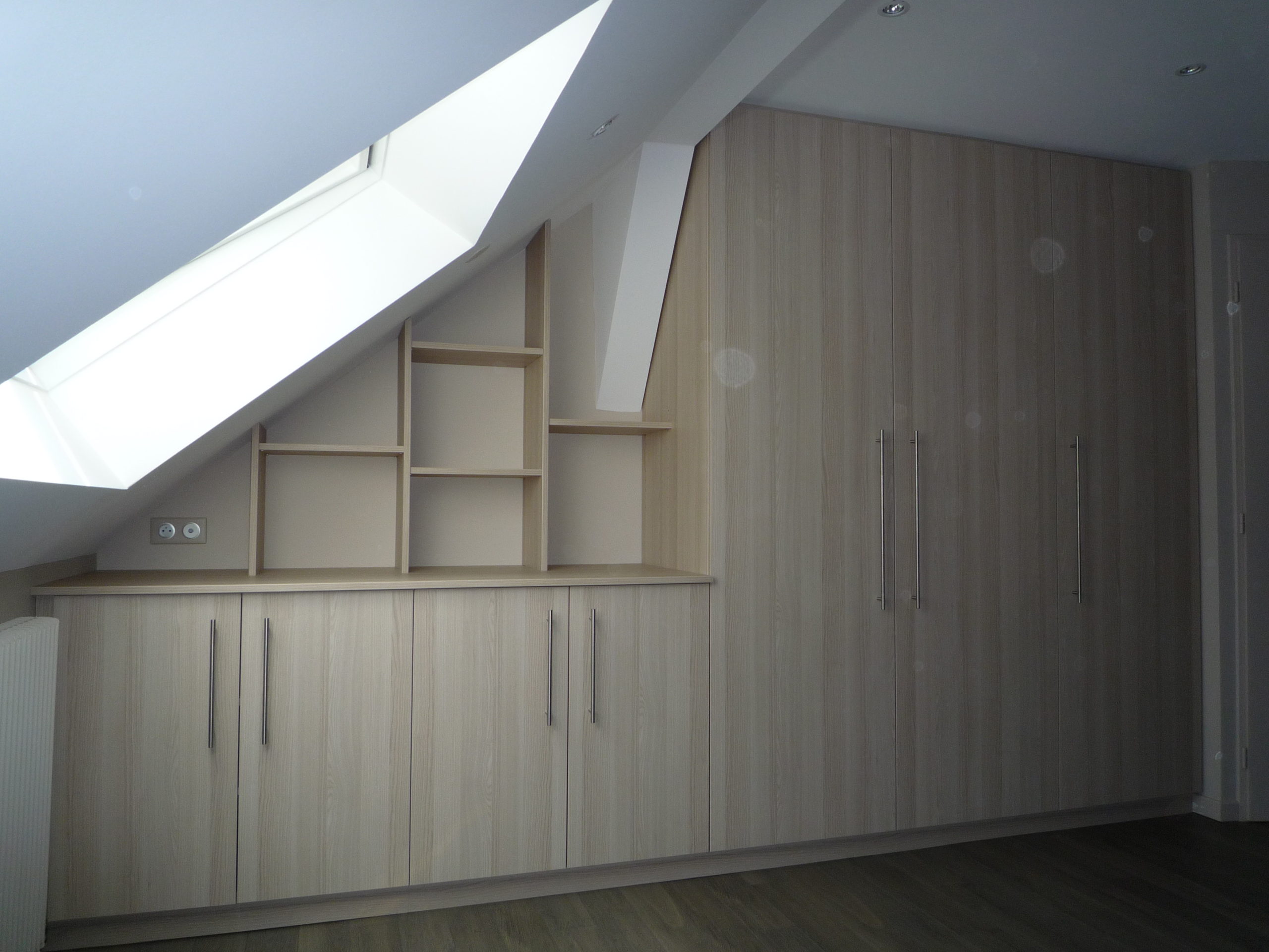 Aménagement de meubles bas et bibliothèque sous rampant..