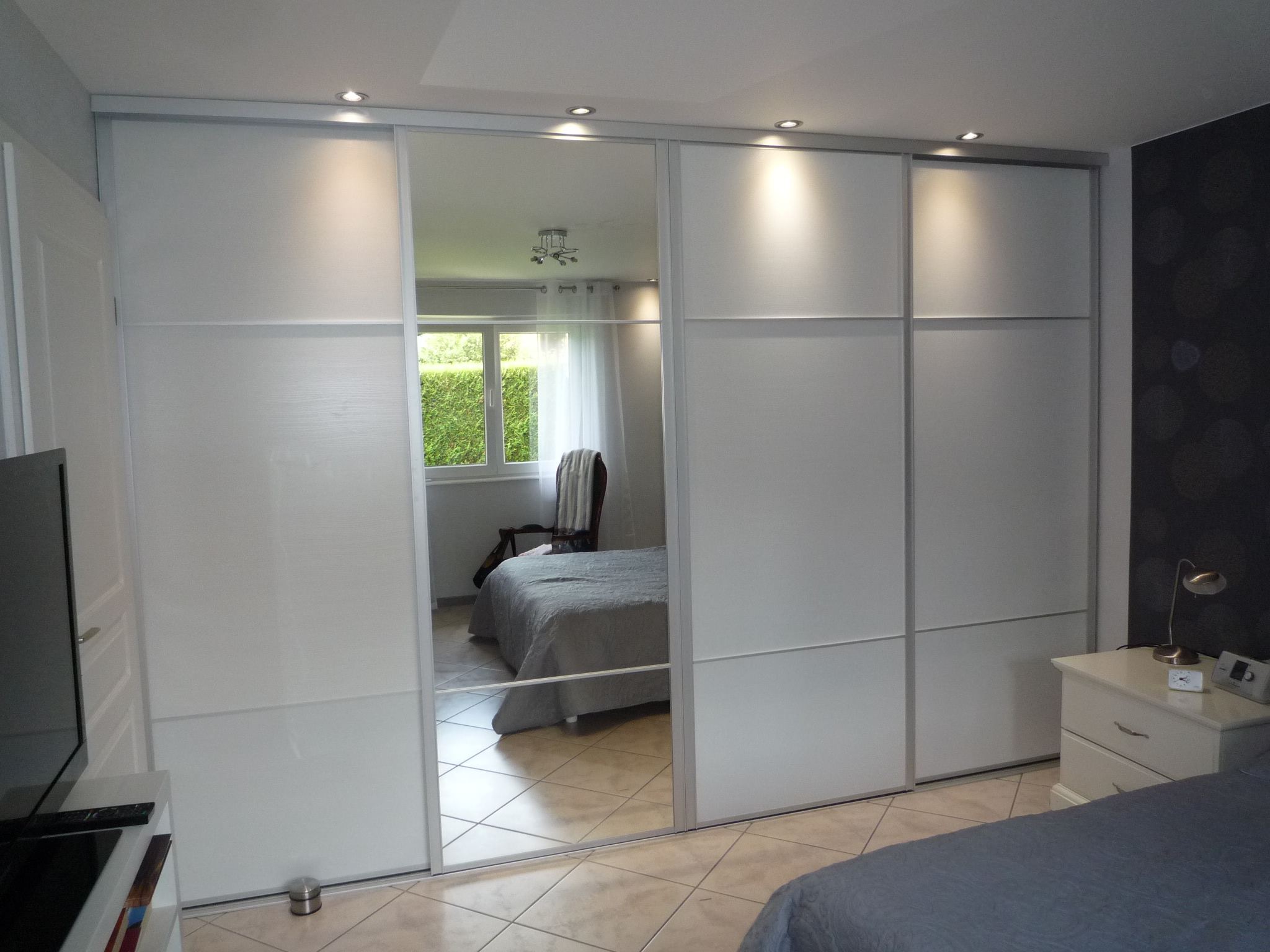Placard à portes coulissantes 3 partitions blanches dont une porte miroir